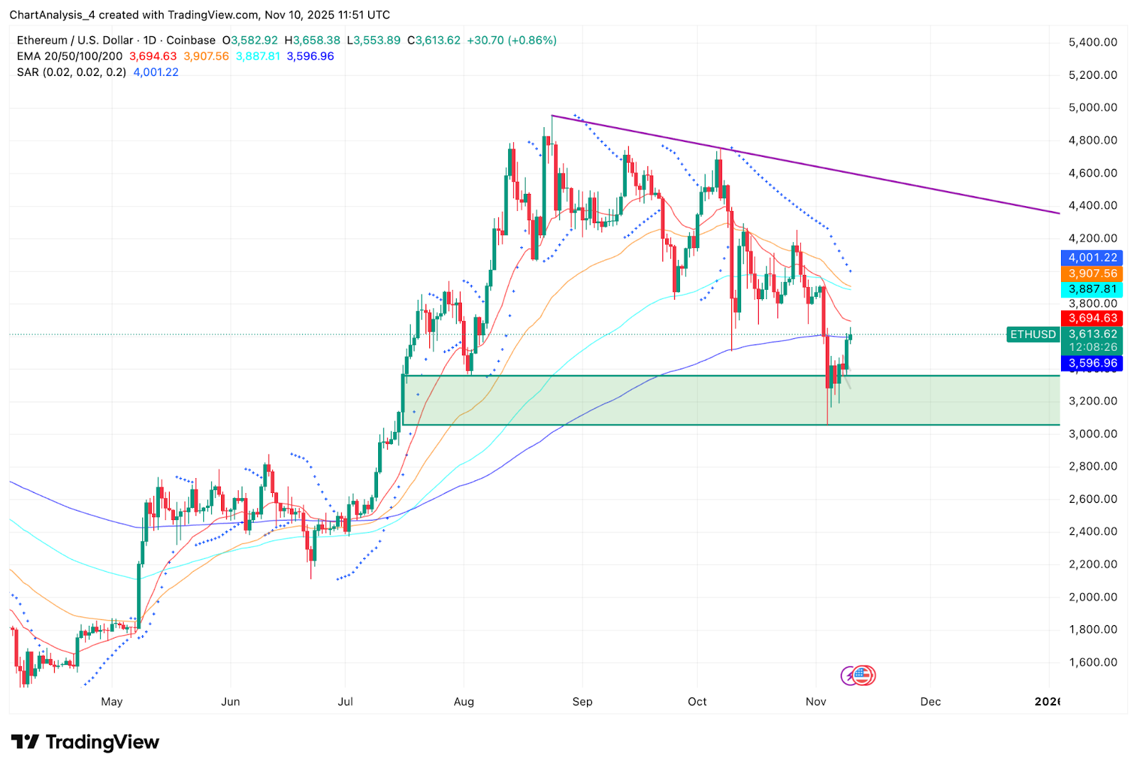 The daily chart shows the price attempting to retake the 20-day and 50-day EMAs. Immediate resistance lies at $3,694 and then $3,887, where the 50-day and 100-day EMAs are concentrated. Above that, the downtrend line from the year-to-date high reaches a price near $4,001. The structure will remain fixed until buyers close above that trendline.