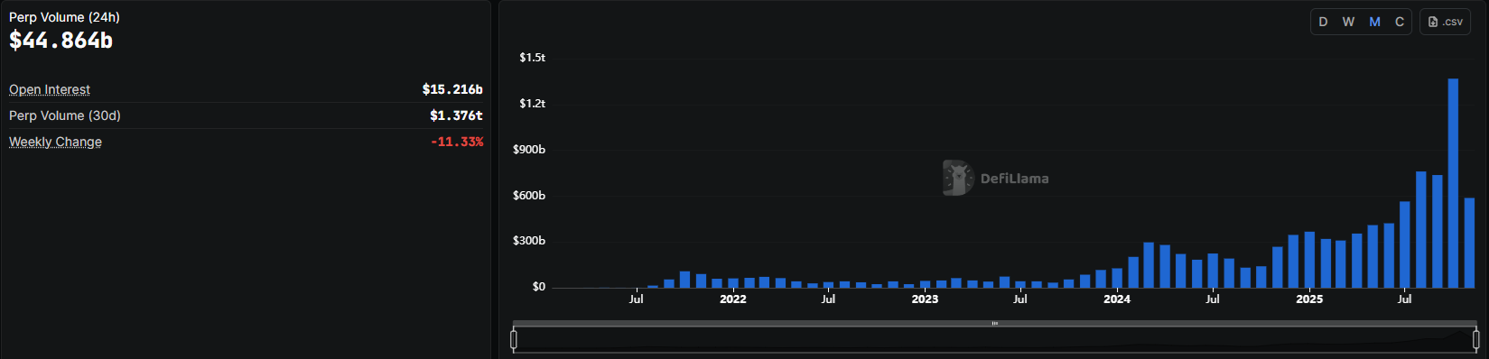 Perp DEX activity reached a record in October, causing a stress test in major markets with record on-chain liquidations. |Source: DeFi Llama