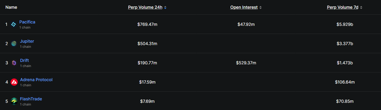 Pacifica, Solana’s fastest growing perpetual futures DEX, took the top spot for most active trading volume. Pacifica has expanded its activities over the past few months in preparation for broader deployment.
